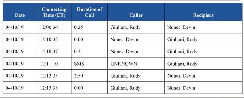 Danh sách cuộc gọi giữa ông Rudy Giuliani và nghị sĩ Devin Nunes trong báo cáo dài 300 trang của Ủy ban Tình báo Hạ viện do đảng Dân chủ lãnh đạo công bố. Ảnh: REUTERS