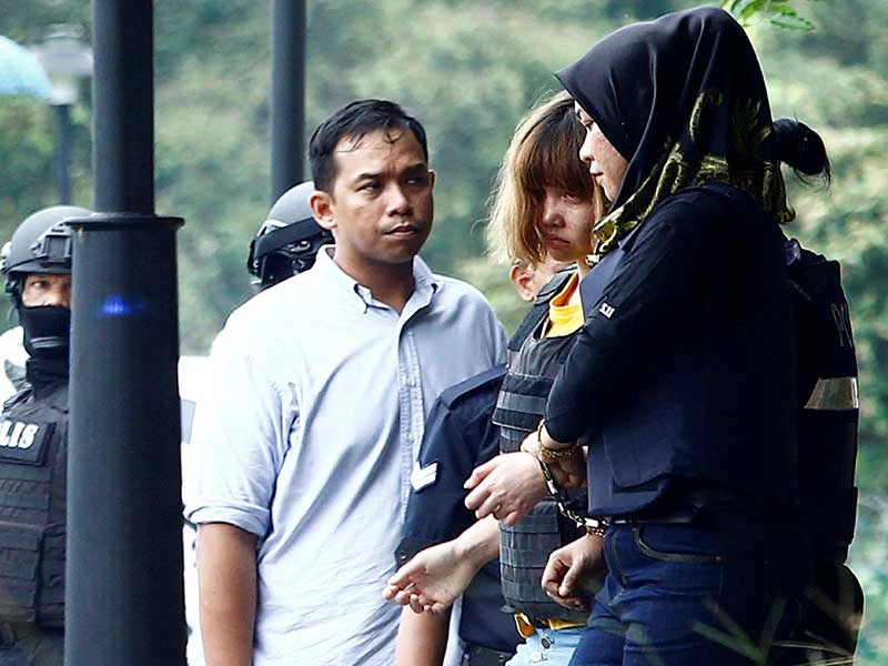 Nghi phạm Đoàn Thị Hương mặc áo chống đạn rời tòa. Ảnh: REUTERS
