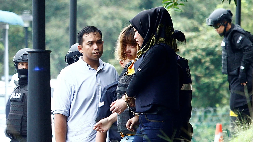 Cảnh sát dẫn giải Đoàn Thị Hương (giữa) sau phiên công bố cáo trạng tại Malaysia. Ảnh: Reuters