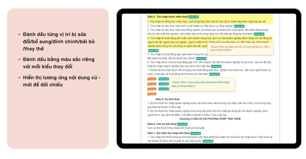 Theo đó, người dùng chỉ cần đọc điều, khoản của văn bản, hệ thống của LuatVietnam sẽ lập tức chỉ ra nội dung đó có còn giá trị áp dụng hay không, đã bị sửa đổi/bổ sung hay bị thay thế bởi văn bản nào hay chưa.