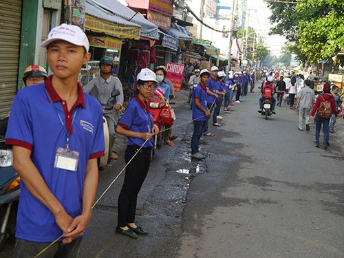 Những sinh viên tình nguyện thiết lập "hàng rào xanh" trên đường Hoàng Hoa Thám. Ảnh Nguyễn Tân