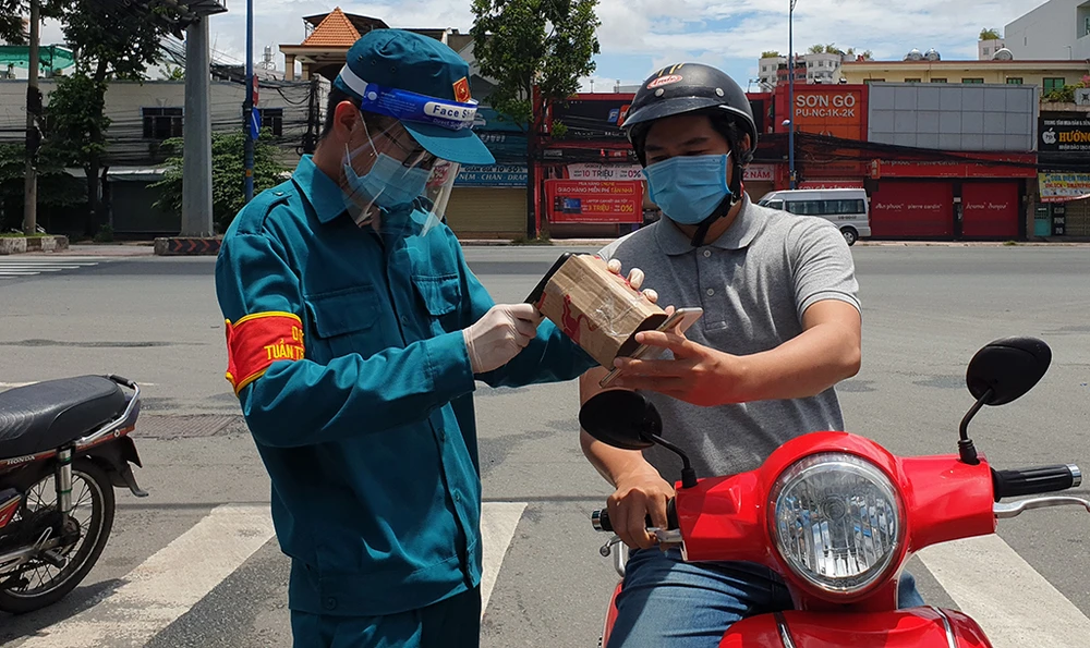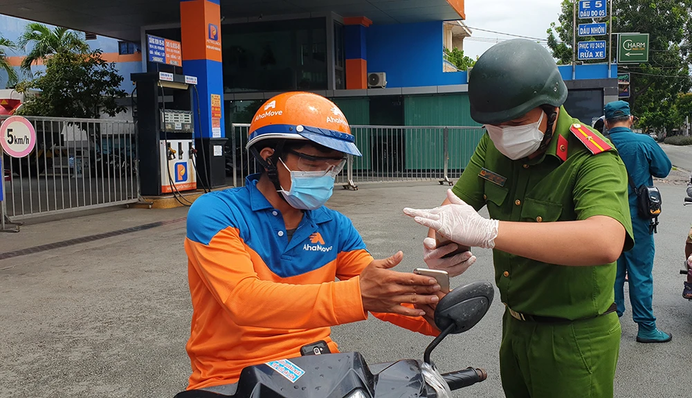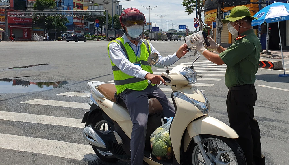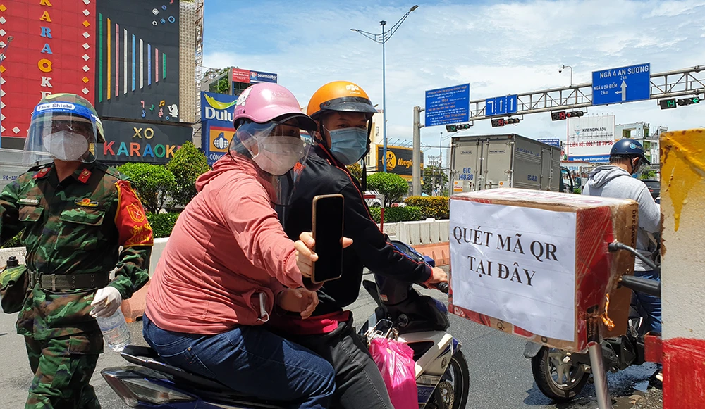 Bà Nguyễn Thị Hai (65 tuổi, ngụ xã Thới Tam Thôn, Hóc Môn) khi đi qua chốt trên đường Trường Chinh thì được các cán bộ yêu cầu xuất trình giấy đi đường, mã QR code. Tuy nhiên bà Hai cho biết mình không rành sử dụng điện thoại 3G.