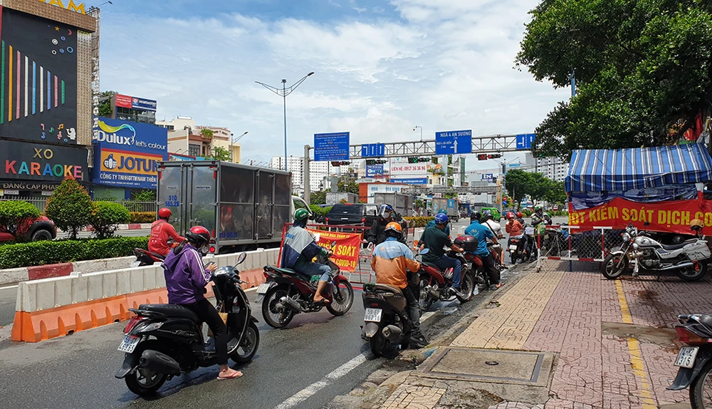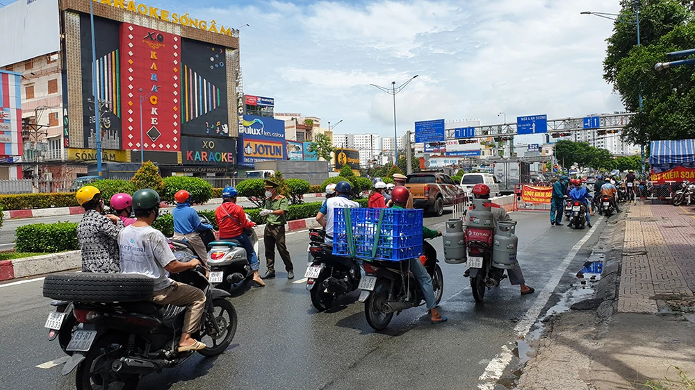 Ghi nhận, ngoài việc quét mã QR, tất cả các phương tiện đi qua chốt đều phải xuất trình giấy tờ cần thiết, kể cả với xe ô tô. Trong trưa cùng ngày, lượng phương tiện trên đường Trường Chinh (quận 12, quận Tân Bình) vừa phải. Trong khi đó, trên đường Tân Kỳ Tân Quý lượng xe khá đông.
