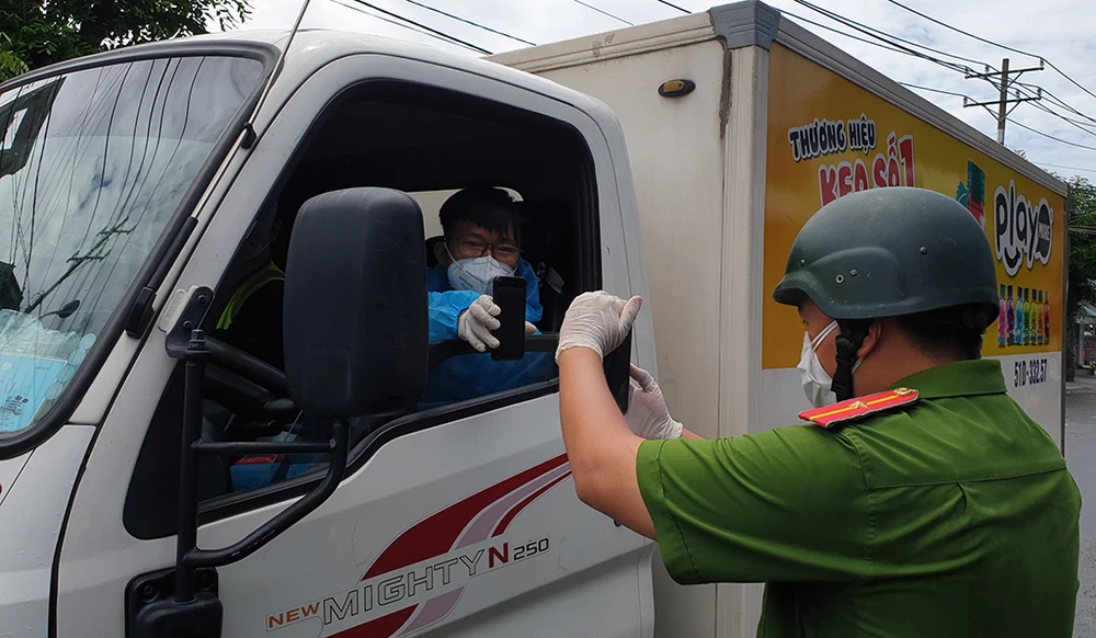 Cũng trong trưa ngày 8-9, ghi nhận tại chốt kiểm soát ở đầu đường Song Hành và đường Nguyễn Văn Quá (giáp ranh giữa phường Đông Hưng Thuận và Tân Hưng Thuận, quận 12) thì không được trang bị camera quét mã tự động. Ghi nhận ở đây, các cán bộ chiến sĩ trực chốt vẫn dùng điện thoại cá nhân để làm công việc này.