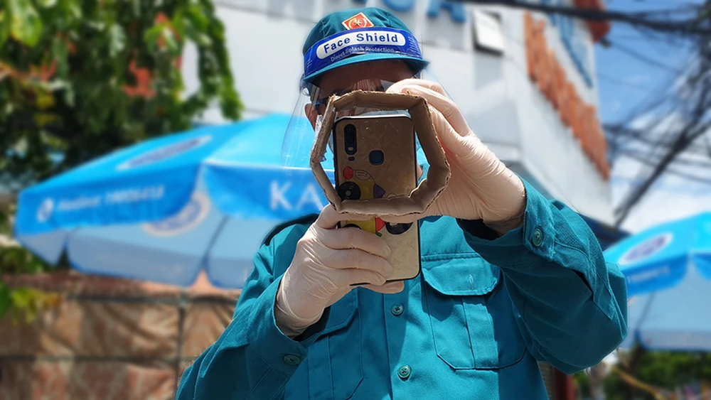 Theo một dân phòng tại chốt, ống được anh tự làm bằng bìa giấy cứng. “Ống này sử dụng vào những thời điểm trời nắng, tránh bị lóa màn hình camera. Như có ống này thì việc quét mã bằng điện thoại cá nhân sẽ nhanh hơn rất nhiều vì nhiều lúc trời nắng, màn hình điện thoại không đủ độ sáng thì khó quét” – người này nói.