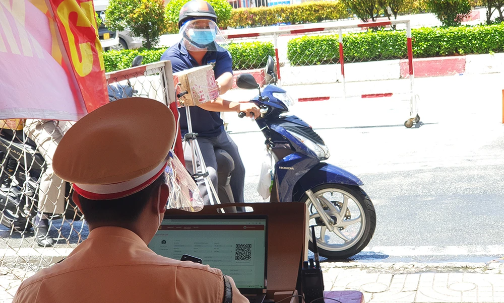 Nếu trường hợp lượng phương tiện tăng cao, lực lượng tại chốt sẽ chia tổ để kiểm tra giấy đi đường, dùng điện thoại cá nhân để quét mã nhằm giảm thiểu ùn ứ. Ảnh NT