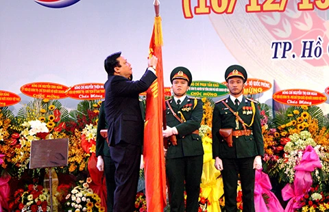 Phó Chủ tịch Quốc hội Huỳnh Ngọc Sơn thừa ủy quyền của Chủ tịch nước trao tặng huân chương Quân công hạng Nhất cho lực lượng vũ trang Quân khu 7. Ảnh: HỒNG PHÚC