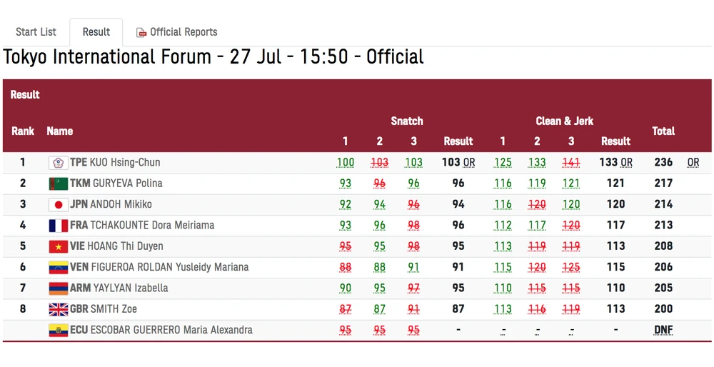 Bảng thành tích nội dung cử tạ hạng 59 kg nữ.