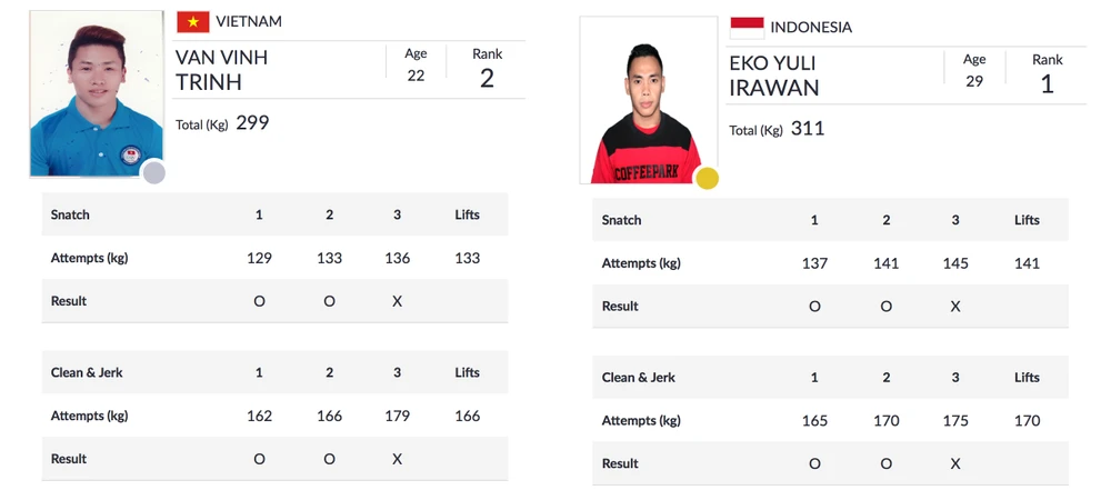 Cùng cạnh tranh huy chương hạng cân này, lực sĩ chủ nhà Eko Yuli Irawan bất ngờ đăng ký mức tạ 137 kg, sau đó nâng lên 141 kg. Lực sĩ 29 tuổi thành công trong cả hai lần nâng. Đến mức tạ 145 kg cử giật, Irawan thất bại nhưng việc chênh lệch 8 kg so với Trịnh Văn Vinh, buộc BHL Việt Nam phải “chơi tất tay” ở nội dung cử đẩy.