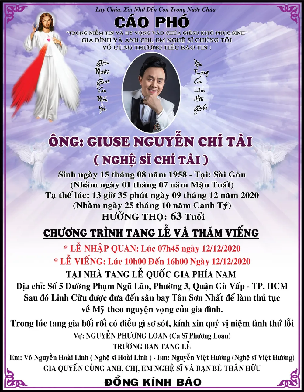 Theo cáo phó mới, nghệ sĩ Chí Tài (Giuse Nguyễn Chí Tài) qua đời vào 13 giờ 35 phút ngày 9-12, hưởng thọ 63 tuổi. Tang lễ sẽ được tổ chức lúc 7 giờ 45 phút ngày 12-12, lễ viếng bắt đầu từ 10 giờ đến 16 giờ cùng ngày tại Nhà tang lễ Quốc gia phía Nam (số 5 Phạm Ngũ Lão, quận Gò Vấp, TP.HCM).