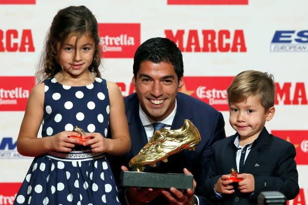 Suarez cùng hai thiên thần của mình trong lần nhận chiếc giày Vàng châu Âu hôm qua