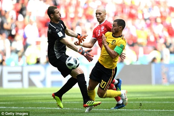 Sau hai tình huống bỏ lỡ liên tiếp của Lukaku và Meunier, tuyển Bỉ rốt cuộc cũng có bàn thắng sớm. Phút thứ 4, hậu vệ Tunisia phạm lỗi với Hazard giữa ranh giới trong và ngoài vòng cấm. Nhờ công nghệ VAR, trọng tài nhanh chóng chỉ tay vào chấm 11 m bất chấp sự phản đối của cầu thủ Tunisia.
