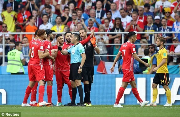 Trọng tài chỉ tay vào chấm 11 m bất chấp sự phản đối của cầu thủ Tunisia.