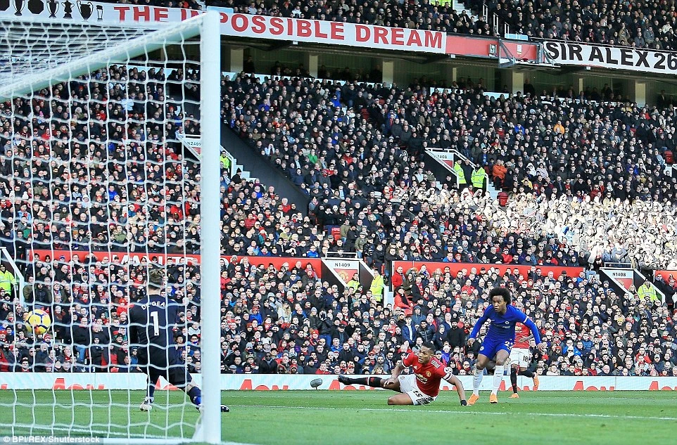 Trong thế trận chặt chẽ đó, Chelsea bất ngờ có bàn thắng mở tỉ số ở phút 30 từ pha phản công mẫu mực. Bóng được các cầu thủ Chelsea cướp từ phần sân nhà và sau đó là một pha phản công hoàn hảo sắc như dao cạo. Hazard có đường chuyền tinh tế cho Willian phá bẫy việt vị thoát xuống sút bóng quyết đoán qua tay De Gea trong thế đối mặt mở tỉ số 1-0 cho Chelsea.