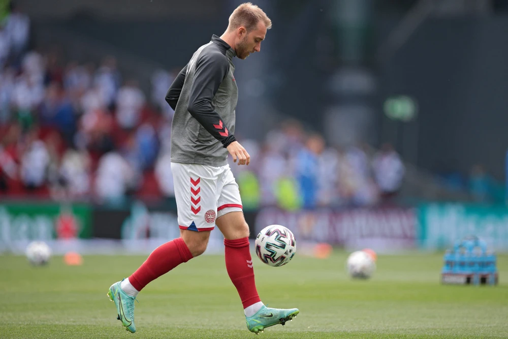Eriksen khởi động trước trận đấu gặp tuyển Phần Lan. ẢNH: EURO
