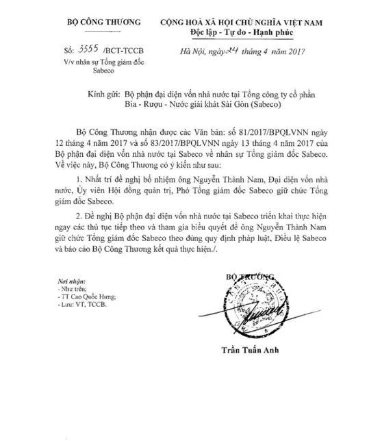 Công văn của Bộ Công Thương gửi Sabeco.