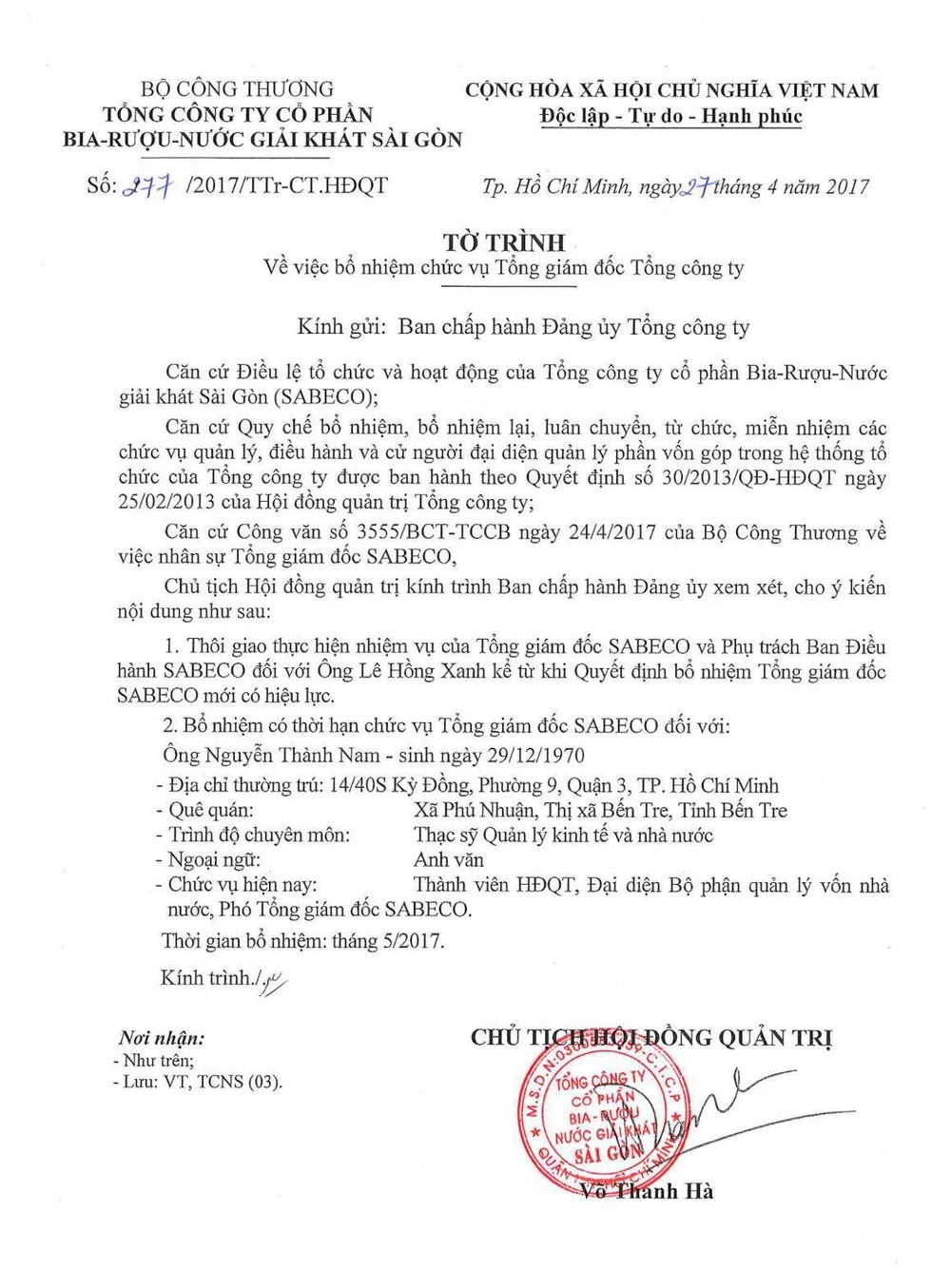Tờ trình của Sabeco về phương án nhân sự Tổng giám đốc.