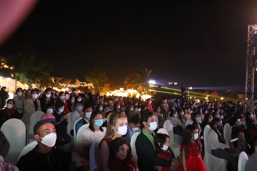 Người dân, du khách tập trung hai bên bờ sông Hoài thưởng thức chương trình nghệ thuật. Đã từ rất lâu, Hội An mới nhộn nhịp trở lại.