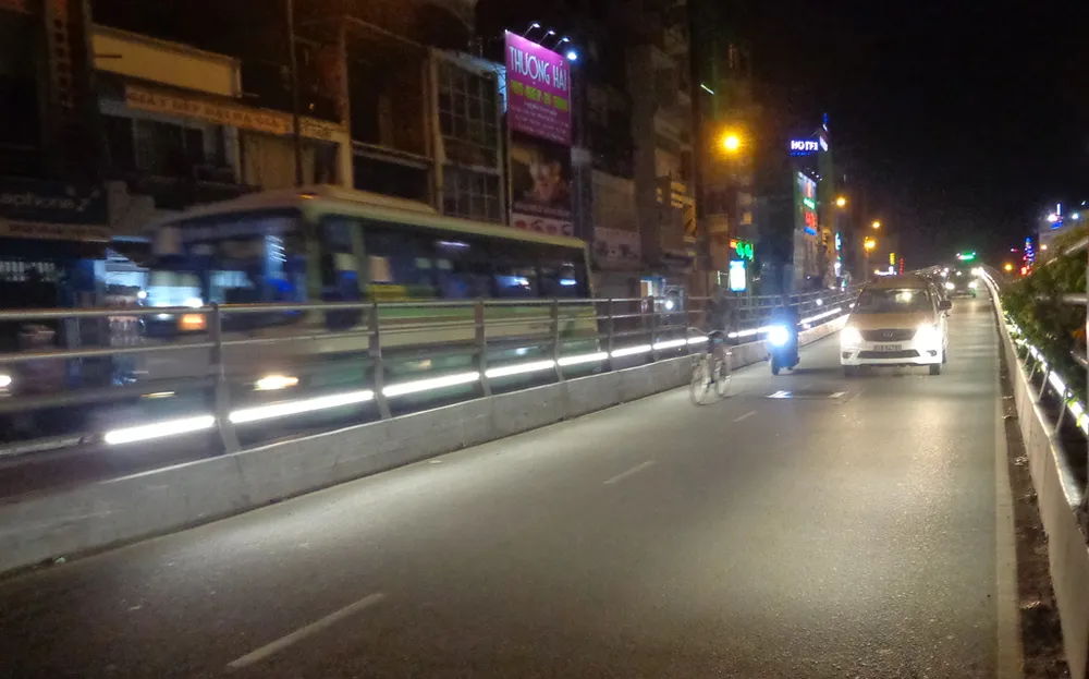 Khi hoàng hôn ập xuống, đèn xe đã bật, nhìn lên cầu vượt thấy hàng 'đinh' tròn xoe chạy dọc theo thành cầu.
