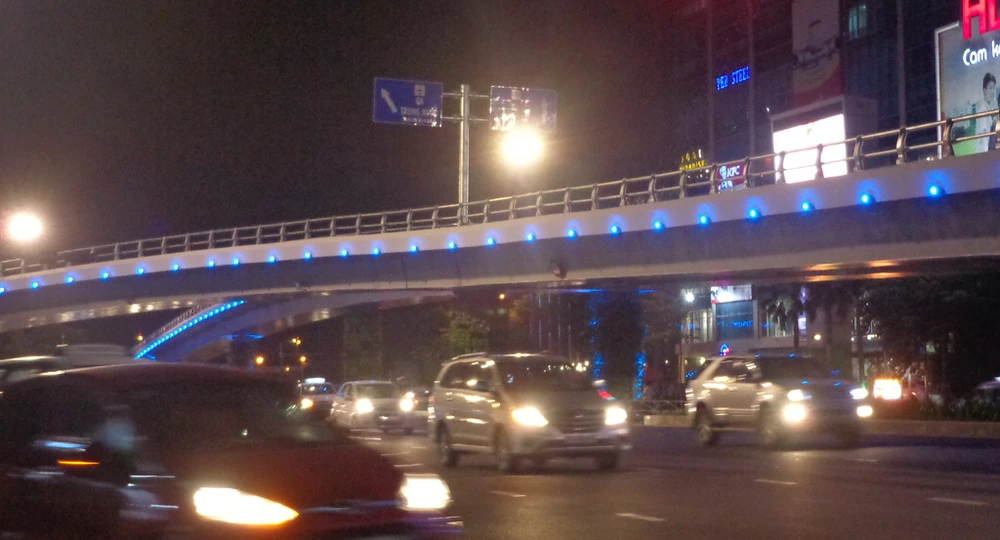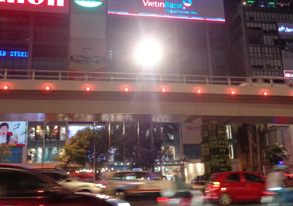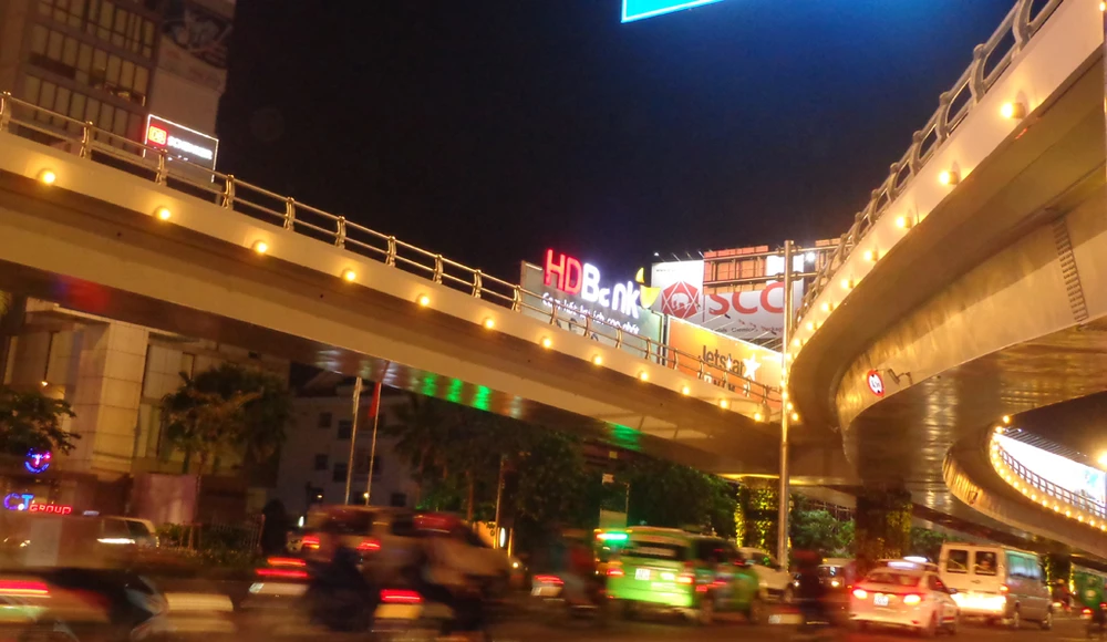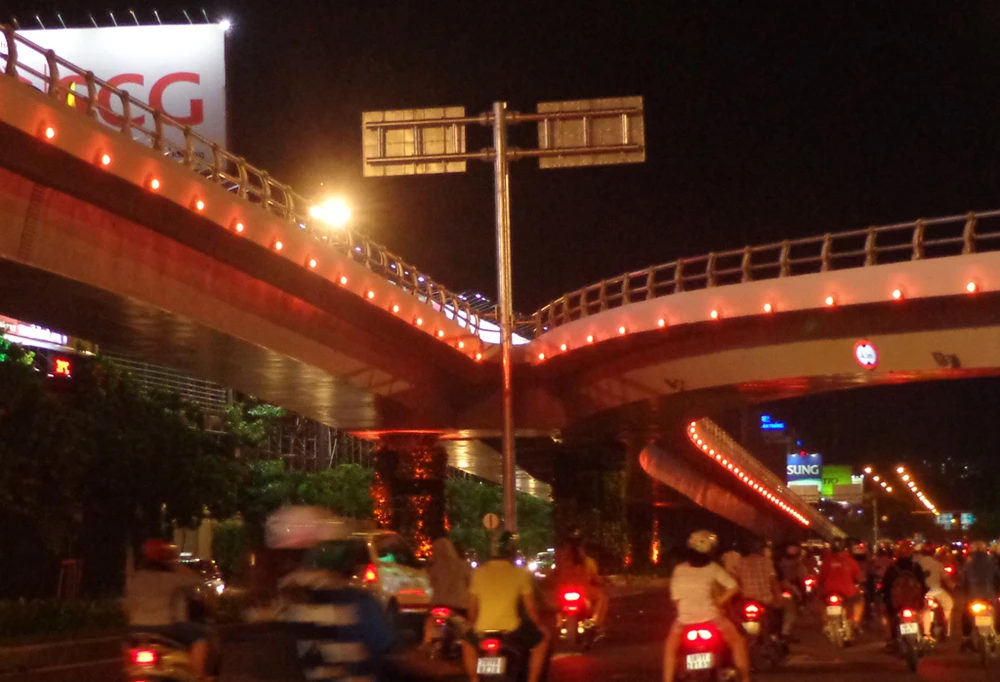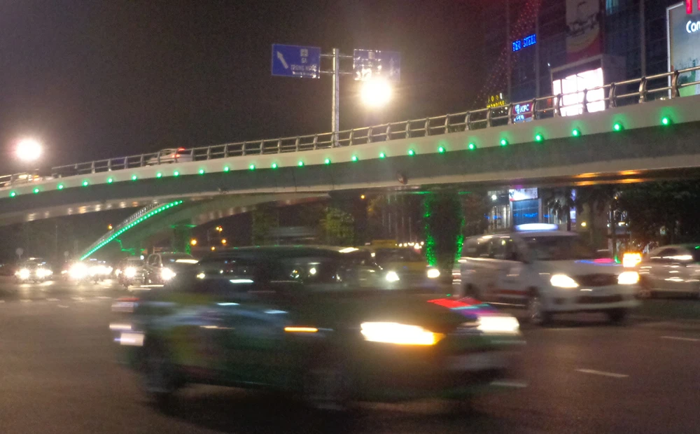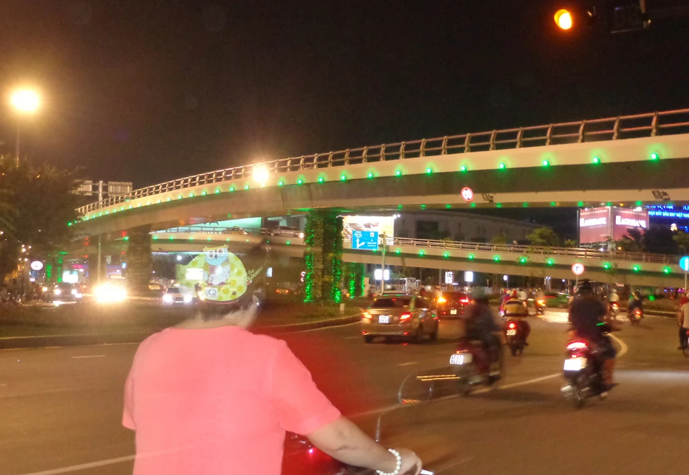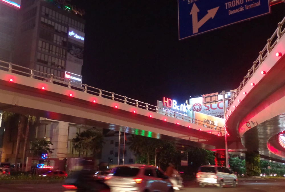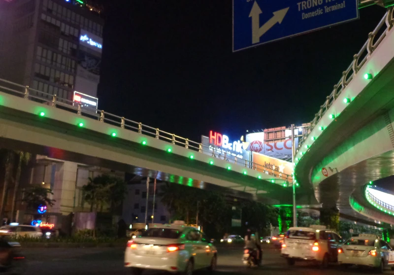 Khi trời tối hẳn thì hàng 'đinh' tròn xoe chạy dọc thành cầu vượt Trường Sơn bắt đầu tỏa sáng. Nó kết hợp với những trụ đèn chiếu sáng lắp trên cao có trước đó tạo ra ánh sáng chiếu trên mặt và dưới dạ cầu vượt.