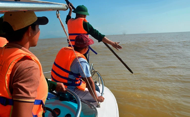 Lực lượng chức năng khảo sát bồi lấp luồng biển Cửa Đại. Ảnh XT