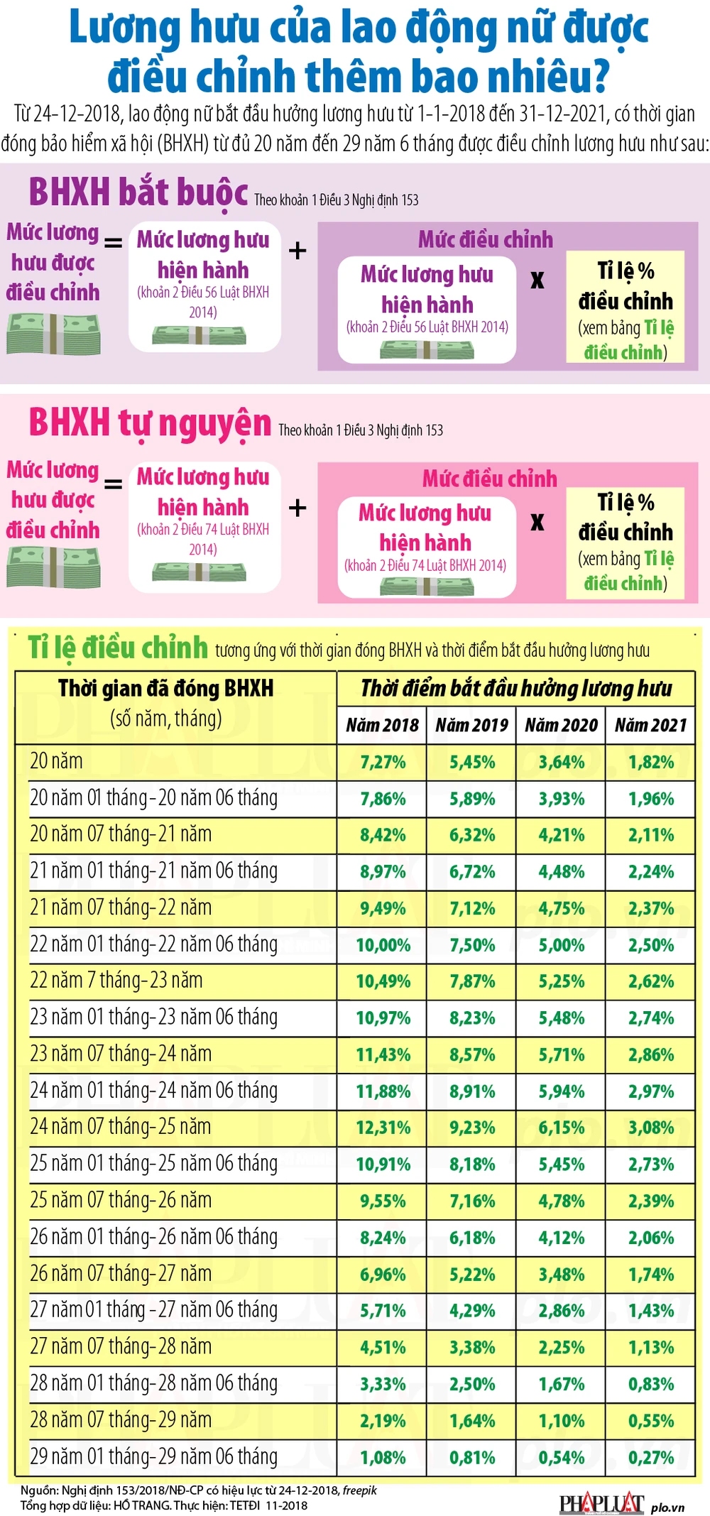 (PLO)- Theo Nghị định 153/2018 có hiệu lực từ ngày 24-12-2018, lao động nữ nghỉ hưu từ 2018-2021 được hỗ trợ thêm tiền tương ứng với thời gian đóng BHXH và thời điểm bắt đầu hưởng lương hưu như sau: