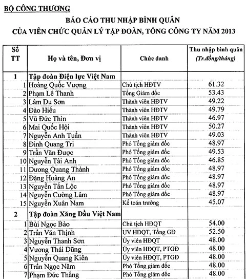 Bộ Công Thương cũng cho hay đã phê duyệt quỹ lương, thù lao thực hiện của viên chức quản lý công ty mẹ các tập đoàn kinh tế và tổng công ty năm 2013 sau khi có ý kiến thỏa thuận với Bộ LĐ-TB&XH. Mức lương công bố đã được thông qua các bộ, ngành quản lý khác như Bộ LĐ-TB&XH, Bộ Tài chính.