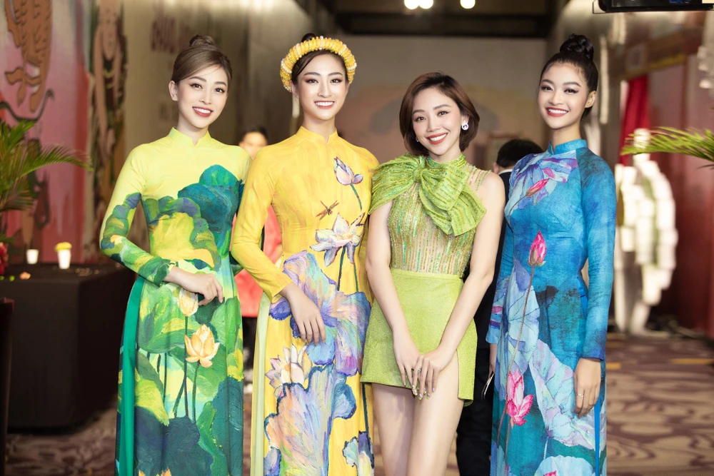 Khác những dịp đến tham dự sự kiện với vai trò khách mời, lần này các nàng hậu Việt Nam lại “hợp sức” với tiết mục mở màn qua liên khúc Cây trúc xinh - Lý cây bông.