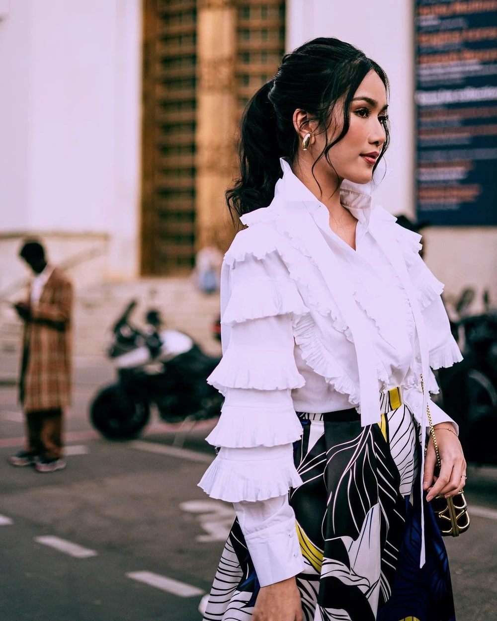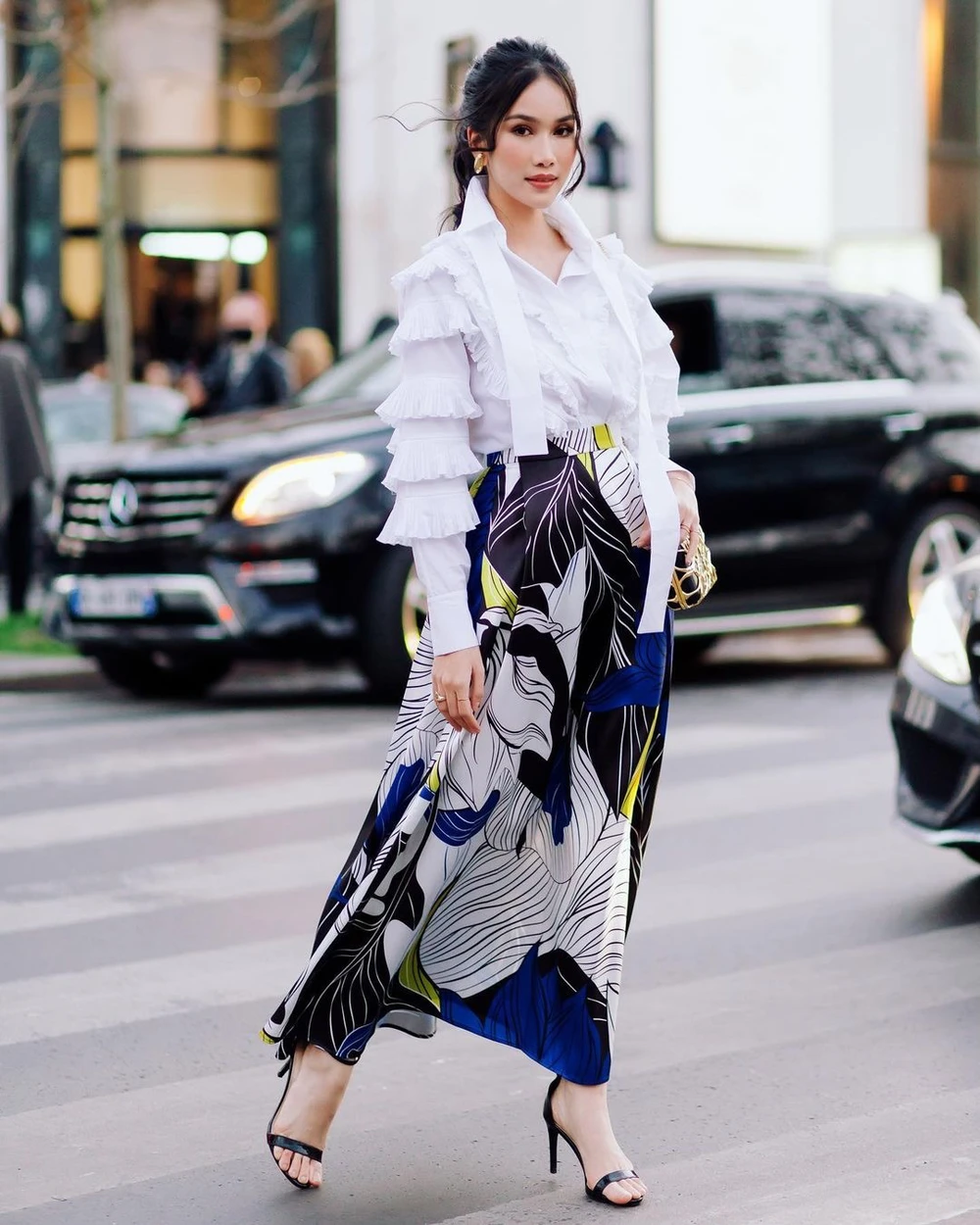 Kết hợp là chiếc áo sơ mi trắng với thiết kế vành xếp tầng ở phần tay. Cách phối đồ này đã làm bật phong cách thời thượng cho Á hậu Phương Anh. Đặc biệt, cô nàng được dành nhiều lời khen bởi layout makeup phù hợp với gương mặt.