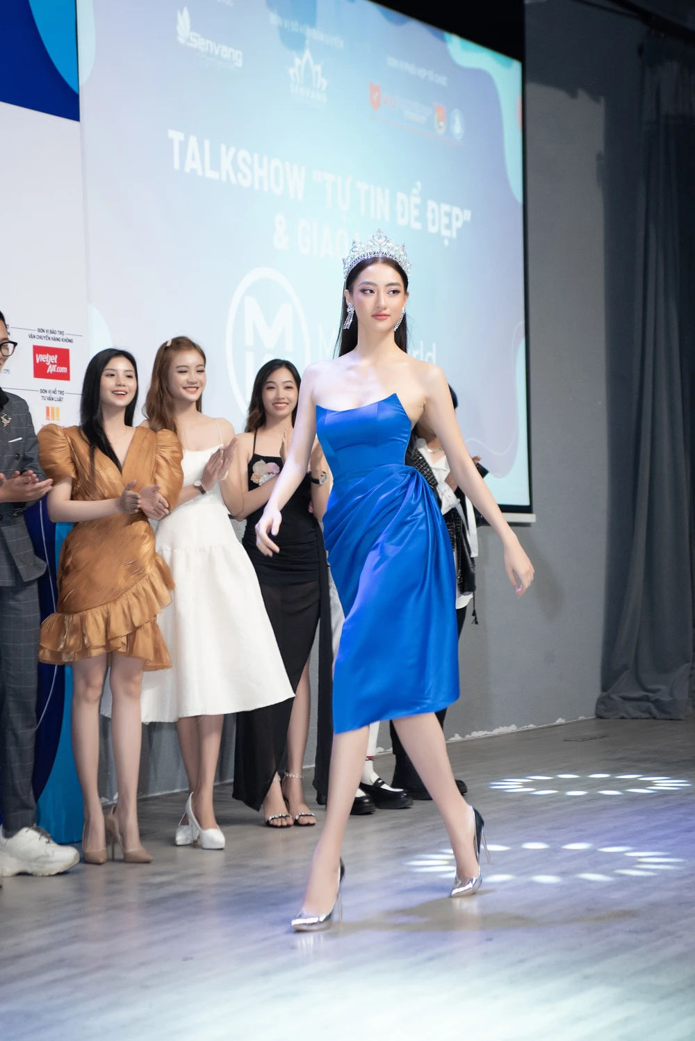 Tiểu Vy, Lương Thuỳ Linh, Kiều Loan và Phương Anh đã hoá thân thành bốn mentor để thị phạm catwalk cho các bạn sinh viên.