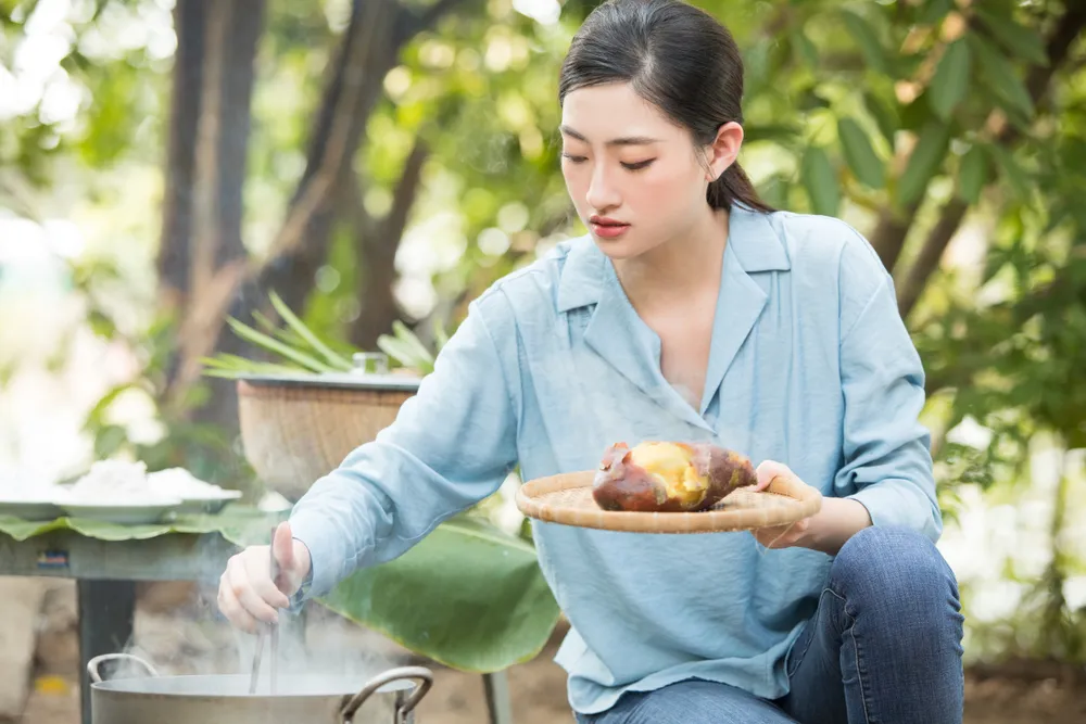 Thậm chí người đẹp còn tự tay ra vườn giữa trưa nắng đào khoai để nấu ra món chè Ỷ khoai lang thơm phức.