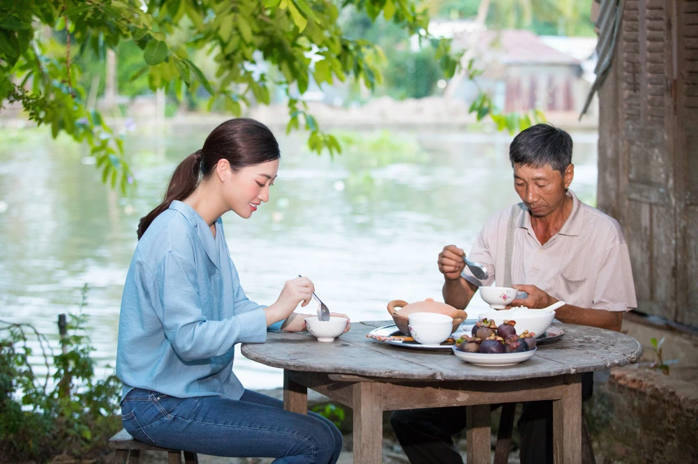 Nàng hậu Cao Bằng cũng vô cùng hứng khởi khi lần đầu được đặt chân đến miền Tây sông nước, gặp gỡ và trò chuyện với những người nông dân chất phác.