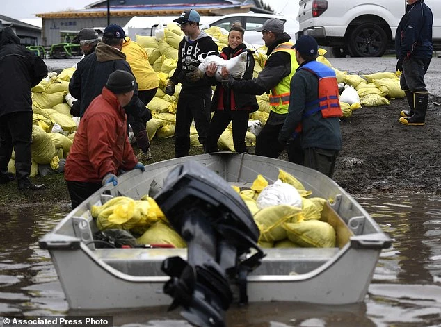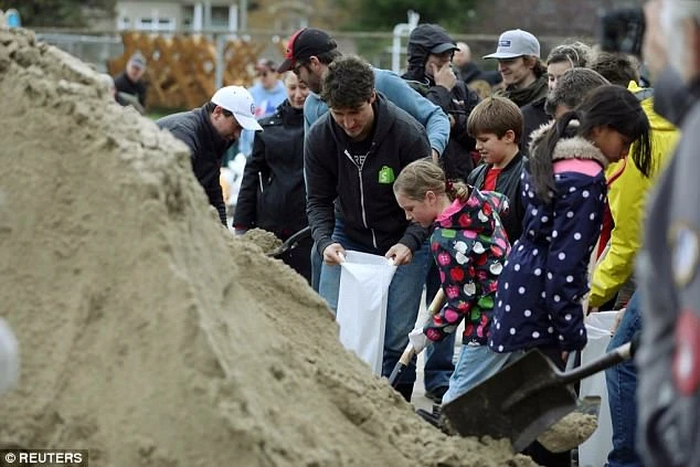 Thủ tướng Canada Justin Trudeau chung tay với người dân bỏ cát vào bao. Ảnh: Reuters