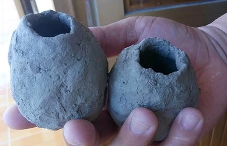 Người dân bảo đây là hai vỏ “lựu đạn độc” nhưng ông A. khẳng định nó là hai trái tu na bằng đất sét trong trò chơi của trẻ con. Ảnh: TRẦN VŨ