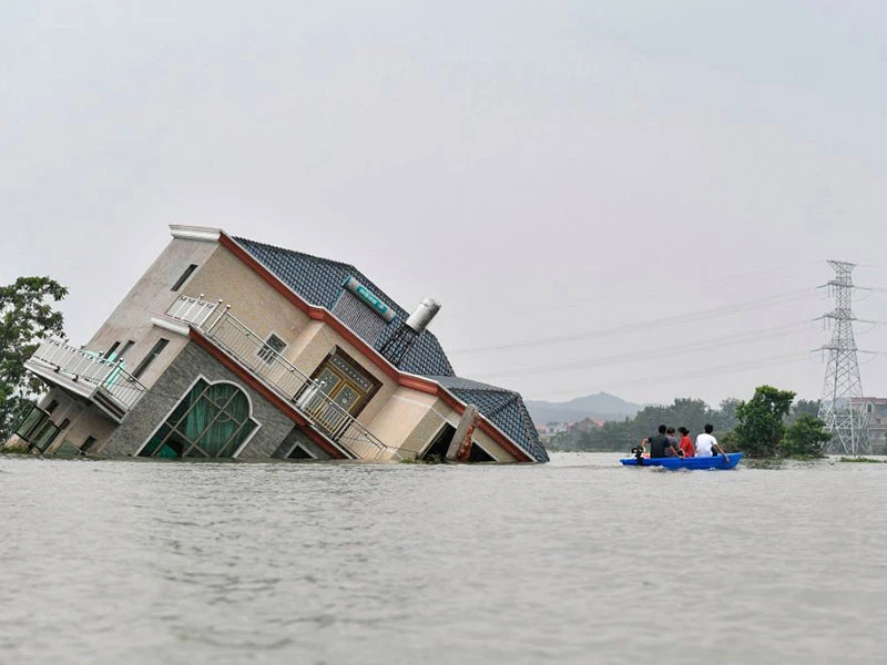Nhà cao tầng đổ nghiêng ở gần hồ Bà Dương, huyện Bà Dương, tỉnh Giang Tây, Trung Quốc trong đợt lũ lụt kỷ lục tháng 7 năm nay. Ảnh: GETTY IMAGES