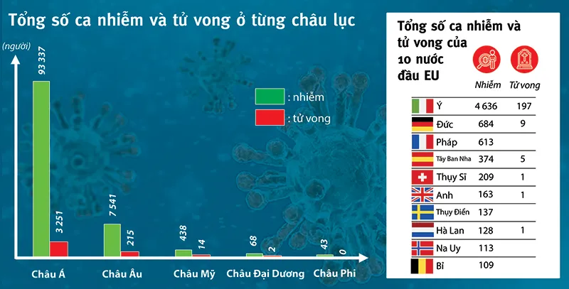 | Dân số già khiến châu Âu khó chống dịch Tờ The Guardian dẫn nguồn nhiều chuyên gia y tế nhận định tình trạng dân số già tại châu Âu đặt ra thách thức lớn trong việc giảm số ca tử vong do COVID-19. Đơn cử, hơn 60% nạn nhân ở Ý đều trong độ tuổi 63-95 và mắc sẵn các bệnh nền. “Châu Âu là châu lục của người già. Người cao tuổi có tiền sử bệnh rất đông. Tôi nghĩ điều này giải thích tại sao chúng ta chứng kiến nhiều ca nhiễm COVID-19 nặng hơn những nơi khác. Ở đa số người lớn trẻ tuổi và trẻ em thì bệnh có triệu chứng nhẹ, ít vấn đề” - GS Massimo Galli thuộc BV Sacco (Ý) giải thích. Tình hình dịch thế giới tính đến hết 8-3 Báo South China Morning Post dẫn số liệu từ Ủy ban Y tế Trung Quốc cho biết tính đến 18 giờ 50 ngày 8-3, tổng số ca tử vong trên toàn cầu vì dịch COVID-19 là 3.648 (tăng 51 ca so với trưa cùng ngày). Tổng số ca nhiễm là 105.804. Có 58.568 ca được chữa khỏi. Trung Quốc ghi nhận 80.695 ca nhiễm và 3.097 ca tử vong. |