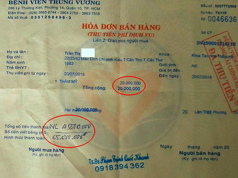 Trước đó, tháng 8-2018, Pháp Luật TP.HCM đã phản ánh việc bạn đọc tố cáo Khoa bỏng - tạo hình thẩm mỹ BV Trung Vương (quận 10, TP.HCM) đã bỏ ngoài hóa đơn 2/3 số tiền mà bệnh nhân đóng viện phí tại BV. PV đã thu thập được chứng cứ thể hiện nhiều bệnh nhân đóng hàng chục triệu đồng/người để phẫu thuật. Tuy nhiên, trong hóa đơn BV chỉ thể hiện 1/3 số tiền đó.