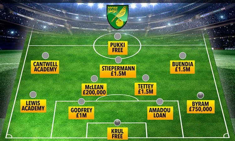 Theo tiết lộ của The Sun ở trận thắng Man City, Norwich tung ra sân 11 cầu thủ bao gồm sáu cầu thủ được chiêu mộ với giá hơn 6,4 triệu bảng, Cantwell và Lewis được đào tạo tại học viện, hậu vệ Amadou đến theo dạng cho mượn trong khi tiền đạo Pukki và thủ môn Krul đến đầu quân theo dạng cầu thủ tự do.