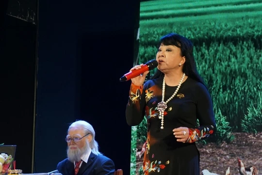 Ca sĩ Hương Lan hát Tình ca Bắc Sơn bên tượng sáp cố nhạc sĩ Bắc Sơn. Chị sẽ làm cố vấn cho cuộc thi "Tiếng hát Tình ca Bắc Sơn khối sinh viên học sinh"