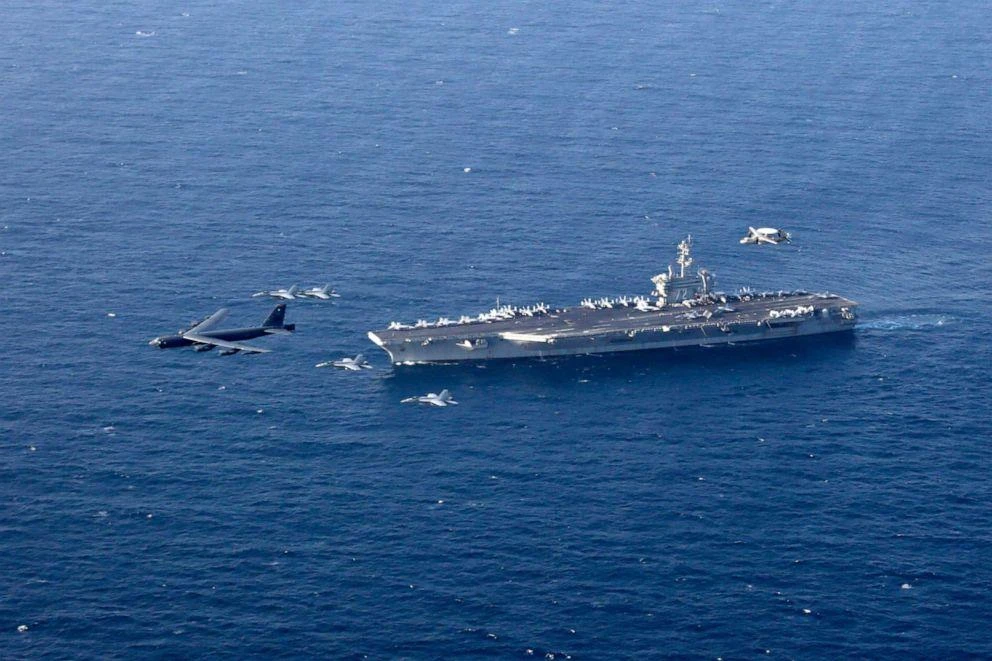 Đội tàu sân bay tấn công USS Abraham Lincoln và một máy bay ném bom B-52H Stratofortress trong một cuộc tập trận chung ở biển Ả Rập. Ảnh: ABC NEWS