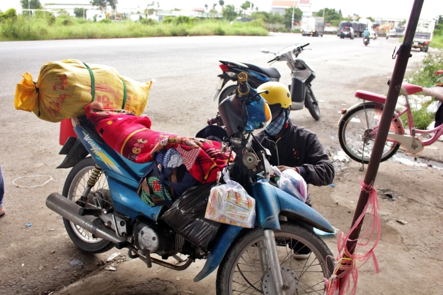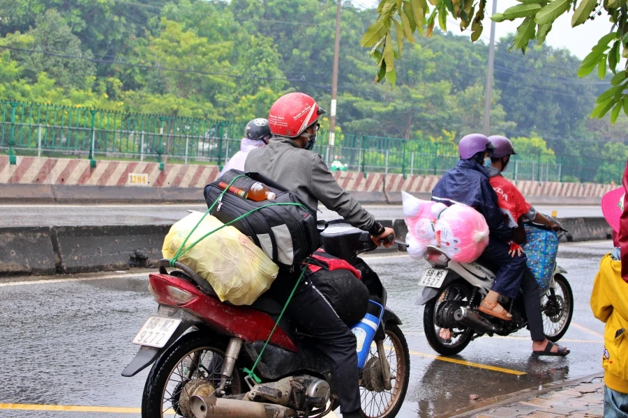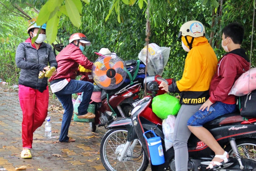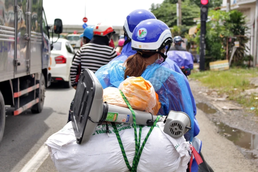 Người dân chở quạt máy, gấu bông... về quê. Ảnh: NGỌC LÀI