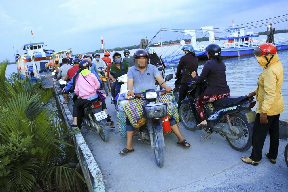 Người lao động xã Lý Nhơn đi phà Dòi Lâu để đến làm việc tại Khu công nghiệp Long Hậu, huyện Cần Giờ, TP.HCM. Ảnh: Nguyệt Nhi