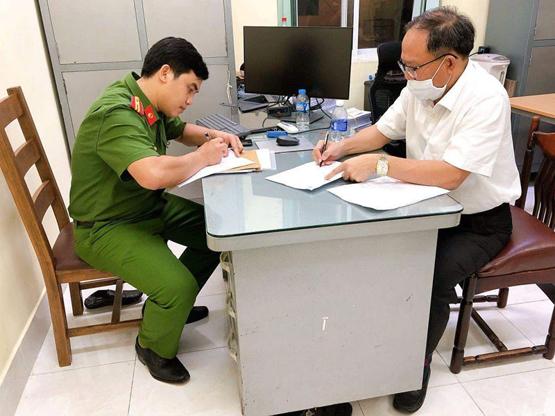 Cơ quan công an thực hiện các thủ tục tống đạt quyết định khởi tố, lệnh bắt tạm giam đối với ông Tất Thành Cang. Ảnh: HT