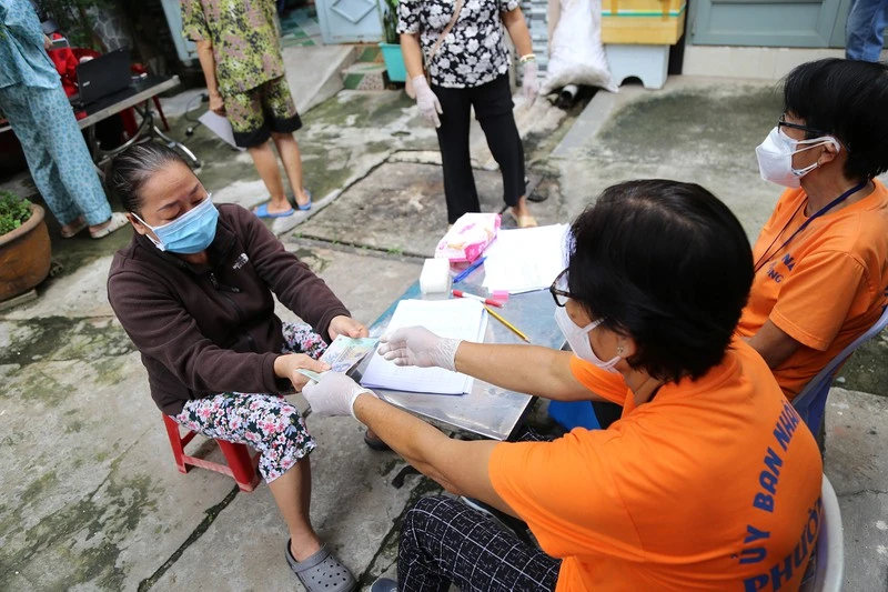 Người dân khu phố 1 phường 5, quận Phú Nhuận, TP.HCM nhận hỗ trợ đợt 3. Ảnh: HOÀNG GIANG