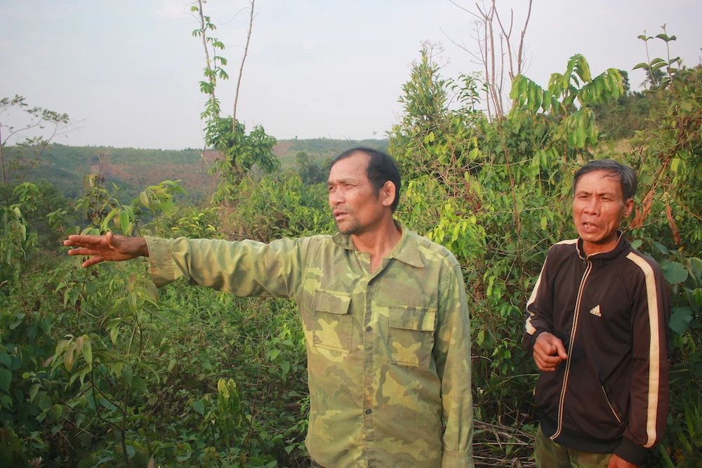 Cựu chiến binh Hoàng Văn Sằn (trái) và Cao Minh Điến cho biết thời điểm dọn dẹp cây bụi đã không còn rừng. Hình ảnh hiện trường vụ án sau 5 năm. Ảnh: NHẬT TIẾN