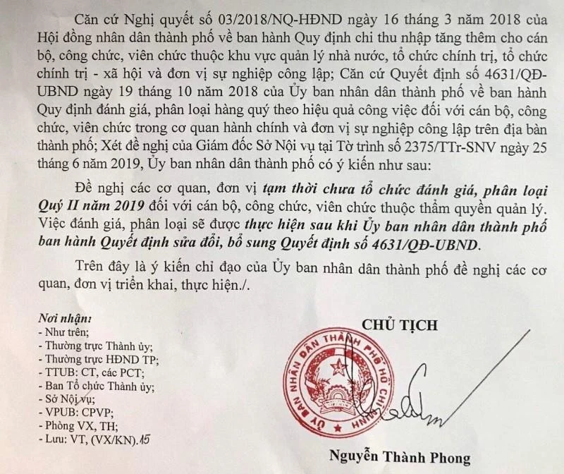 Theo đó, ông Nguyễn Thành Phong đề nghị các cơ quan, đơn vị tạm thời chưa tổ chức đánh giá, phân loại quý 2-2019 đối với cán bộ, công chức, viên chức thuộc thẩm quyền quản lý. Việc đánh giá, phân loại sẽ được thực hiện sau khi UBND TP ban hành quyết định sửa đổi, bổ sung quyết định số 4631/QĐ-UBND.
