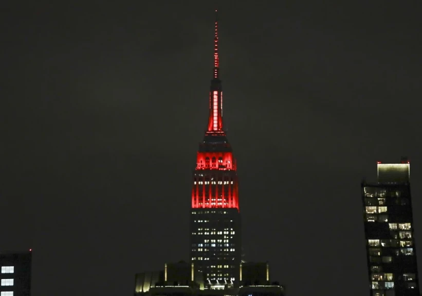 Tòa nhà Empire State được thắp đèn màu đỏ và trắng nhằm tôn vinh những nhân viên y tế khẩn cấp ở New York. Ảnh: AP