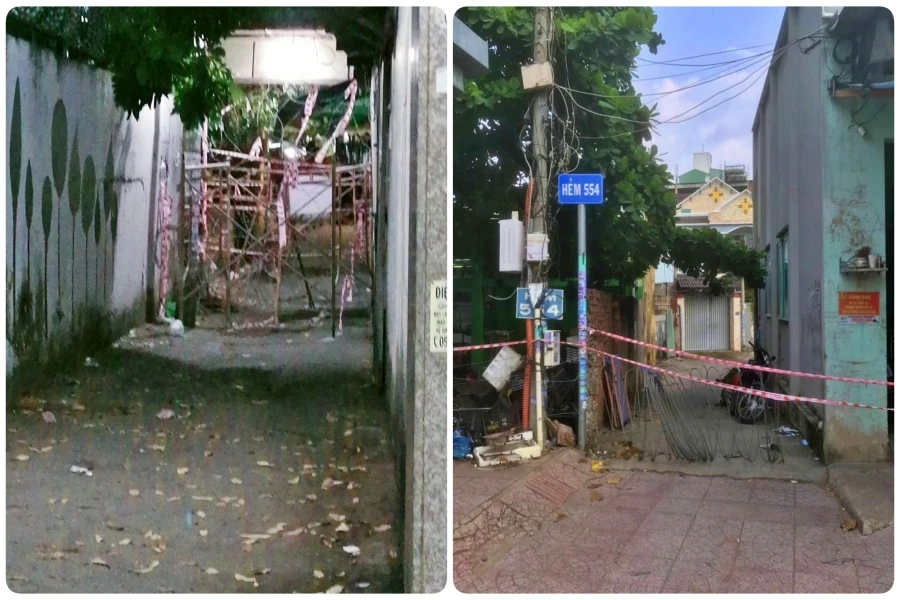 Khu phong tỏa ở hẻm 391 Huỳnh Tấn Phát (bên trái) và hẻm 554 Lê Văn Việt bị rào bằng dây kẽm gai. Ảnh: Người dân cung cấp.