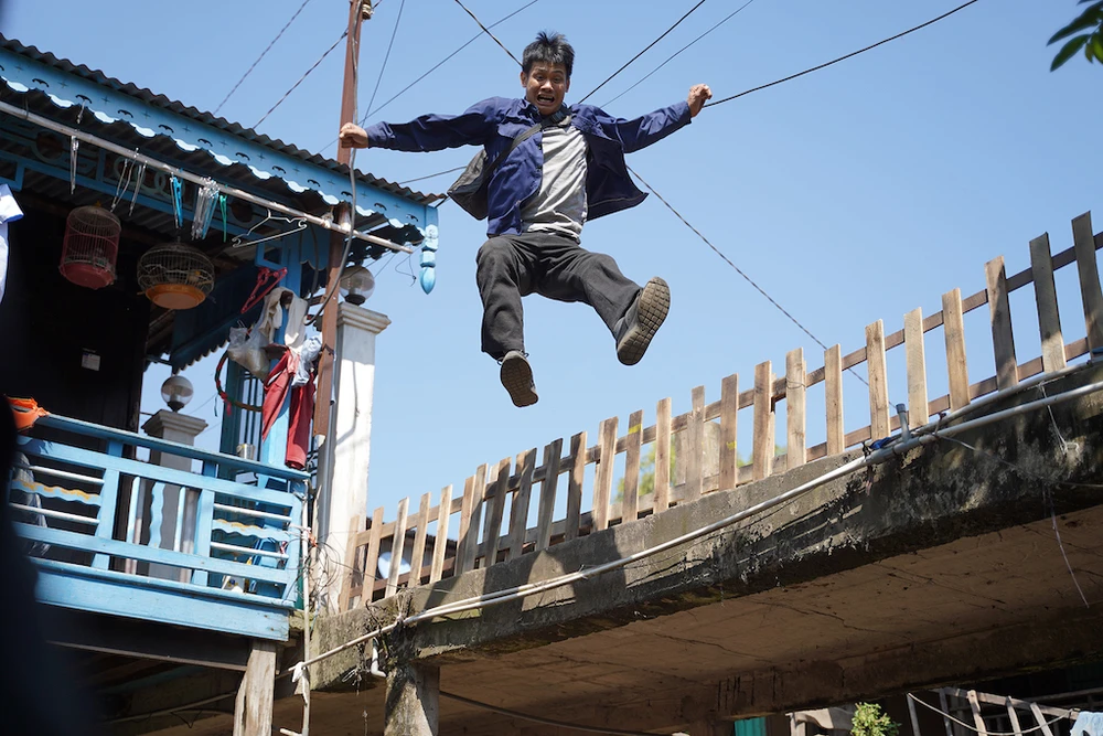 Hậu trường cú nhảy nguy hiểm để cứu Mạc Văn Khoa của Võ Thành Tâm. Ảnh: Đoàn làm phim cung cấp