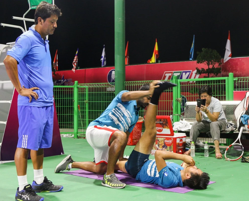 HLV Ivan Miranda (trái) và trợ lý giúp Hoàng Nam hồi phục sau cuộc chiến nghẹt thở. ẢNH: ANH KHOA